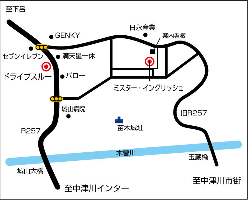 中央自動車道中津川ICを下車し、中津川市街方面の出口から出てすぐに左に逸れ、R257を中津川市街地方面に進みます。