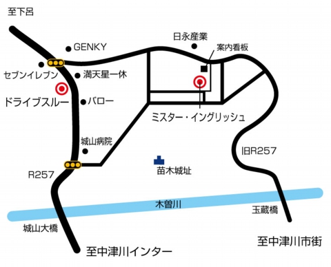 中央自動車道中津川ICを下車し、中津川市街方面の出口から出てすぐに左に逸れ、R257を中津川市街地方面に進みます。